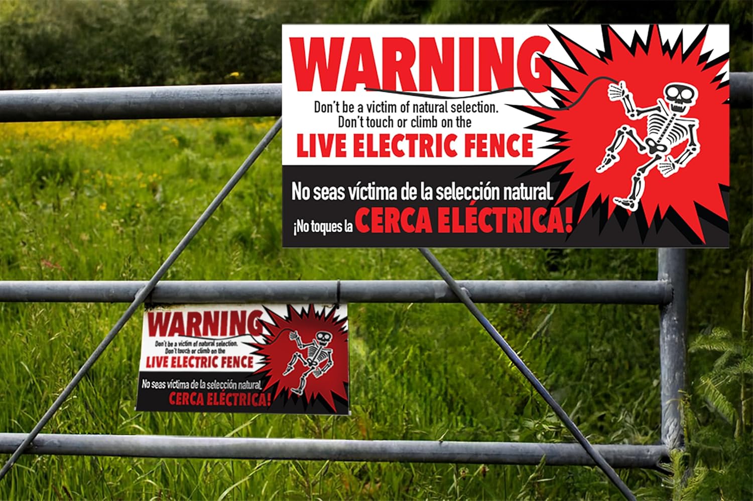 ★ Message: “Don’t be a victim of natural selection. Don’t touch or climb on the LIVE ELECTRIC FENCE” (English + Spanish)